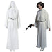 This is an officially licensed, complete costume replica of Princess Leia's iconic white gown and hairstyle as seen in Star Wars: Episode IV - A New Hope (1977). The set includes the detailed dress, a faux hair piece styled into her signature side buns, and an authentic-looking belt.