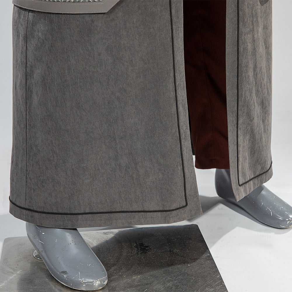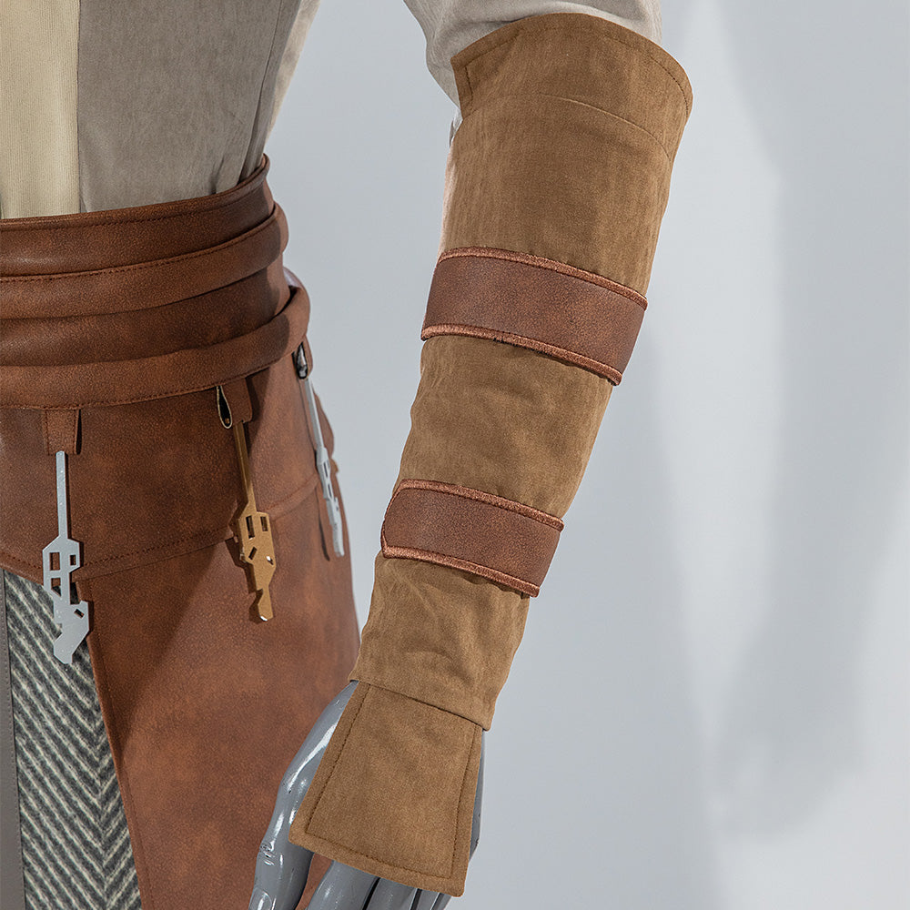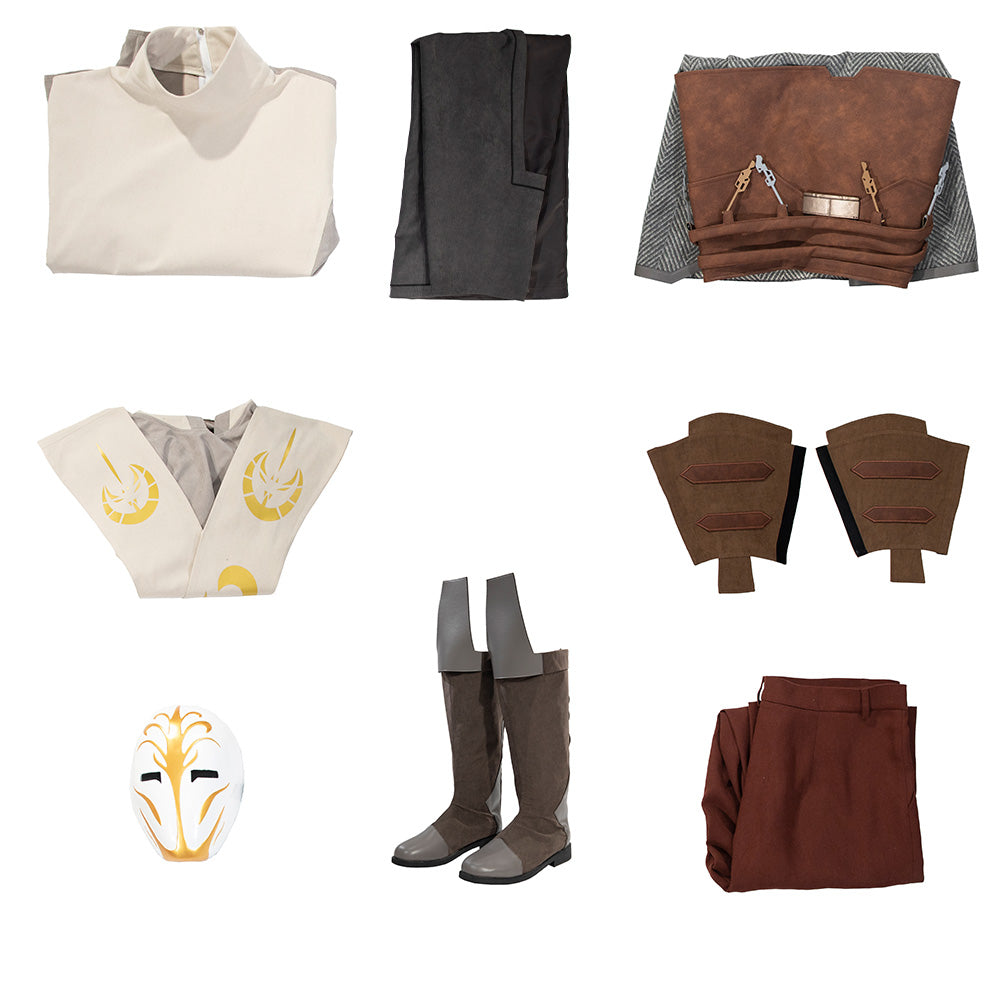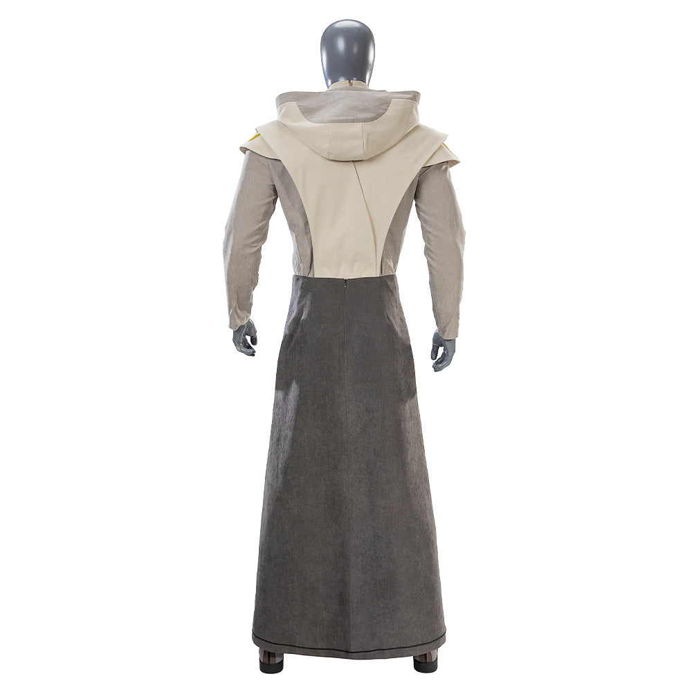 The set includes a hooded tunic, flowing outer robe, waist sash, pants, boot covers, and the signature rigid helmet with fabric draping. Made from a premium blend of cotton and suiting fabric, it is designed for both durability and screen-accurate authenticity.