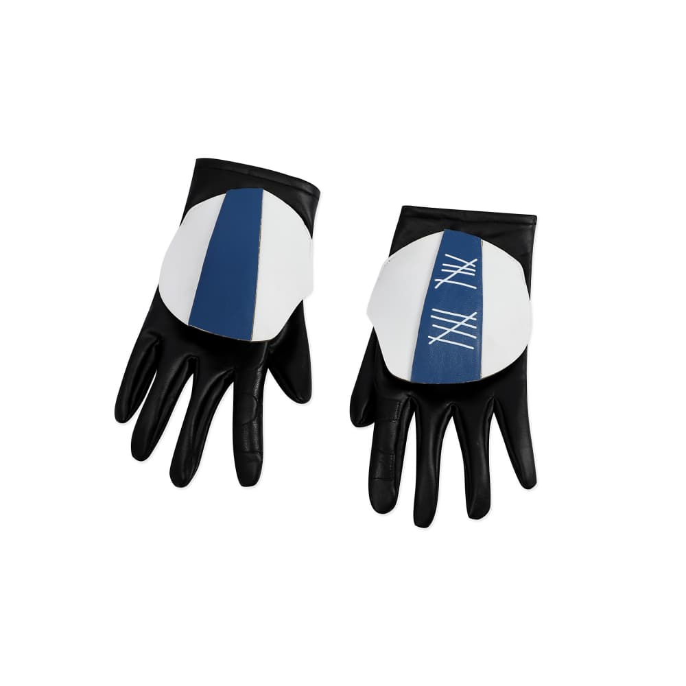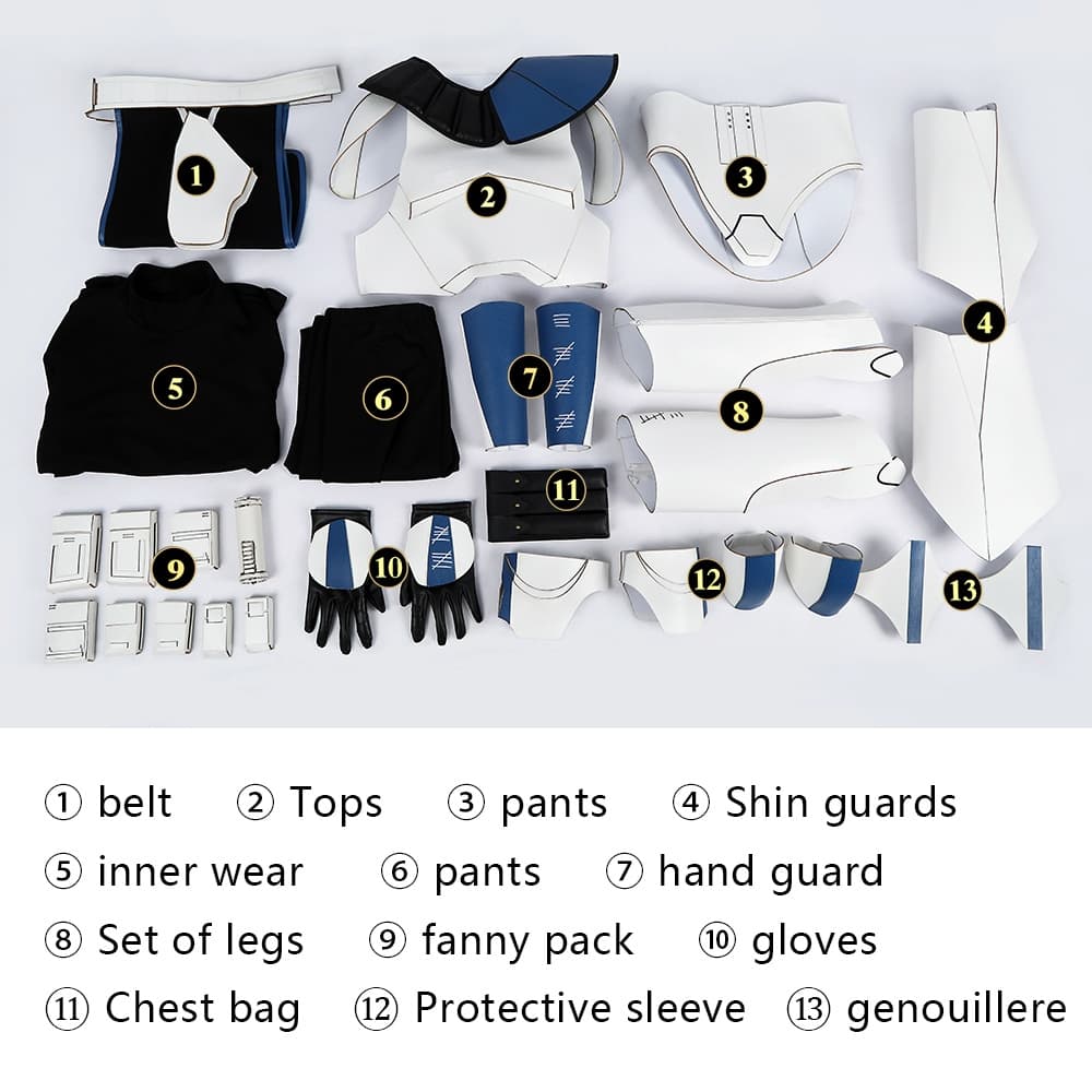 The ensemble includes a molded chest plate, backplate, shoulder guards, kama (waist skirt), and fully compatible gauntlets. The standout feature is the meticulously detailed character helmet, complete with the signature range finder and macro-binoculars. The set also includes a black body glove to wear underneath, providing a seamless and comfortable fit for the complete armored look.